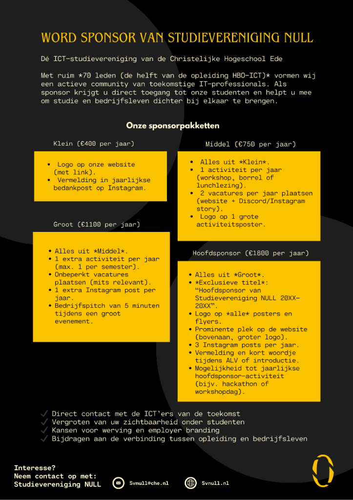 Word partner van studievereniging NULL en krijg direct toegang tot 70+ gemotiveerde HBO-ICT studenten.